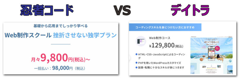 また、忍者codeは独学プラン以外は全てデイトラの受講料よりも高額となります。
