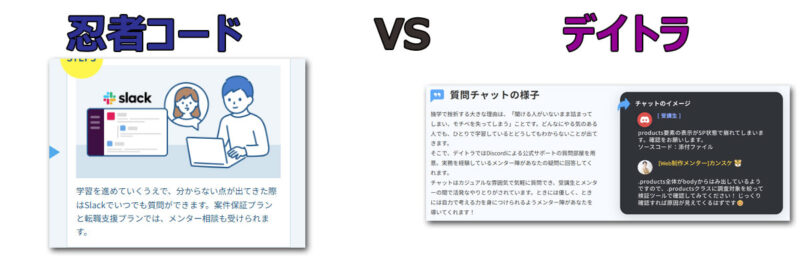 表にも記載してありますがデイトラのサポートは1年間のグループチャットに対して、忍者codeは1対1の無期限チャットサポートとメンター相談があります。(独学プランはメンター相談はありません)