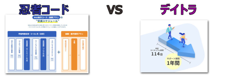 デイトラでは想定カリキュラムの期間が114日に設定されており、忍者codeでは実際の受講生が学習終了するまでの期間が約5~6ヶ月(副業プランの場合)と公式サイトに書かれていました。(両スクール共、WEB制作コースにて比較)